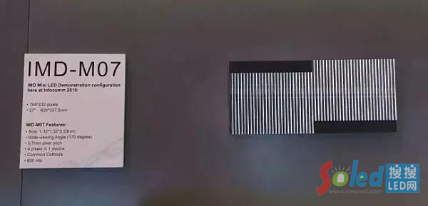 2018年6月8日,國(guó)星光電自主研發(fā)的首款Mini LED IMD-M0 9器件在中、美兩地同步首發(fā)。在2019年美國(guó)InfoComm 展會(huì)上,國(guó)星光電展示了P0.7間距的Mini-LED模組。