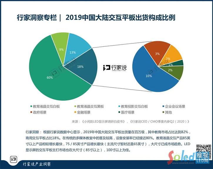 此前,產(chǎn)業(yè)界更多把焦點(diǎn)放在企業(yè)會(huì)議市場,據(jù)行家說《小間距LED顯示屏調(diào)研白皮書》數(shù)據(jù)顯示,在2019年中國大陸交互平板出貨量在百萬級(jí),而其中教育市場占比則達(dá)到82%。