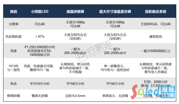 針對(duì)85英吋以上的市場,液晶拼接屏?xí)嬖谄纯p問題,且長期使用,單元間亮度與色彩衰減不一致,不可恢復(fù),雖然成本較低,但比較影響視覺觀感。投影雖然不需要拼縫,但在色彩飽和度、亮度方面和壽命方面相對(duì)處于劣勢,另外燈泡需要定期更換,維護(hù)成本較高,且需要各種輔助性設(shè)備,整體應(yīng)用成本較高。
