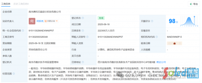 近日據(jù)天眼查信息顯示,南充惠科芯晶顯示科技有限公司正式成立,法定代表人為何懷亮,注冊資本達(dá)22.23億人民幣,經(jīng)營范圍包括半導(dǎo)體照明器件制造、半導(dǎo)體照明器件銷售、半導(dǎo)體器件專用設(shè)備銷售等。股東信息顯示,該公司由南充振慶產(chǎn)業(yè)發(fā)展投資基金合伙企業(yè)(有限合伙)、惠科股份有限公司共同持股。早在今年5月24日,南充市(成都)重點產(chǎn)業(yè)投資推介暨應(yīng)用場景發(fā)布會在成都舉行。當(dāng)天上午,順慶區(qū)人民政府與惠科股份有限公司成功簽約。