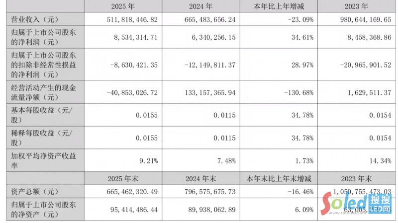 4月22日,聯(lián)建光電(300269)公布2025年年報(bào),公司營(yíng)業(yè)收入為5.12億元,同比下降23.1%;歸母凈利潤(rùn)為853萬元,同比上升34.6%;扣非歸母凈利潤(rùn)自去年同期虧損1215萬元變?yōu)樘潛p863萬元,虧損額有所減少;經(jīng)營(yíng)現(xiàn)金流凈額為-4085萬元,同比下降130.7%;EPS(全面攤薄)為0.0155元。